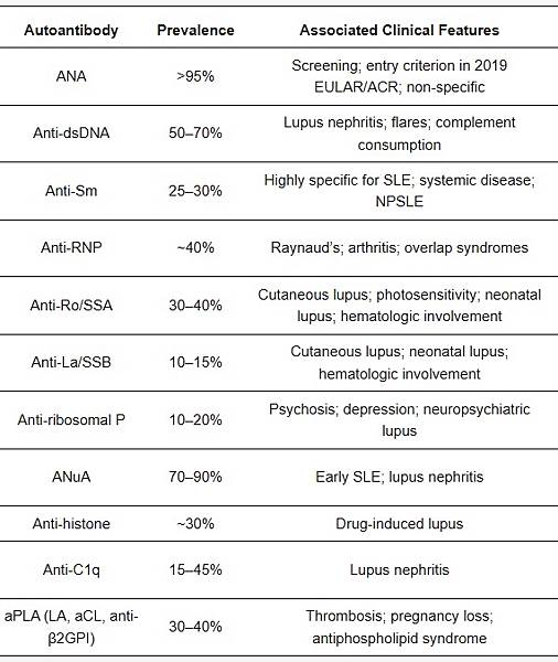 最複雜的自體免疫疾病是全身性紅斑狼瘡(Systemic lupus erythematosus,SLE),發病時血中可測到的自體抗體超過十種,下面是SLE病人血中的自體抗體: