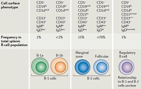 圖二:B cell的分類。細菌或病毒感染時,B1a cell產生的Natural antibody是第一道防線,B1b cell是第二道防線,Marginal zone B cell是第三道防線,過了這三道防線,感染擴大,就必須啟動T cell immunity活化Follicular B cell。Regulatory B cell(Breg)的主要功能是抑制自體抗體產生。