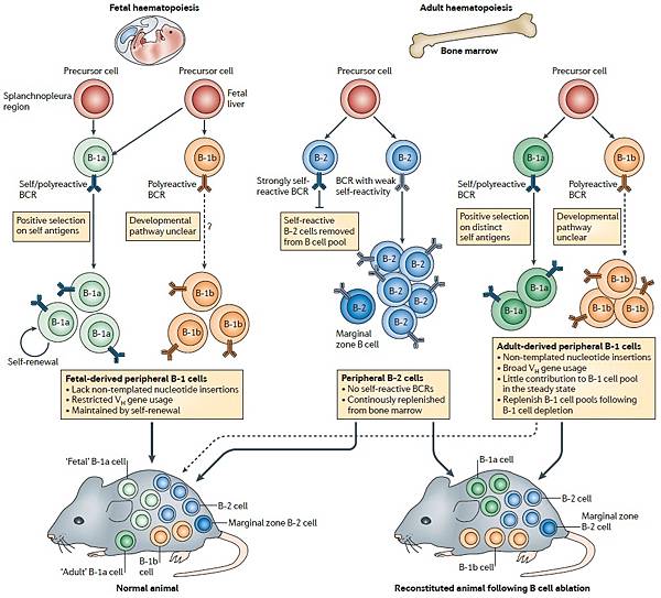 新生兒滿六個月時,抗體Heavy chain(IgH gene)與Light chain(IgL gene)的基因重組(IgH-VDJ重組,IgL-VJ重組)達到高峰,B cell clone數高達nx1010,分成B1與B2兩群,如下文圖一: