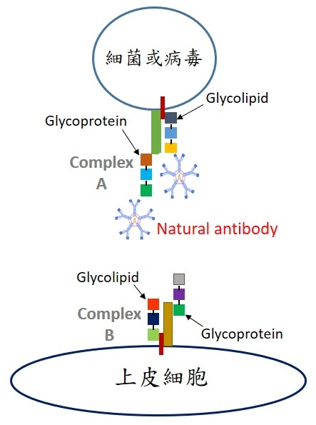 細菌或病毒要感染上皮細胞必須突破層層抗體的防線,外膜上有一種醣蛋白(Glycoprotein)/醣脂質(Glycolipid)的複合體(Complex A)與上皮細胞胞膜上的受體(Receptor)結合,Receptor也是由醣蛋白/醣脂(Complex B)構成。Complex A 與 Complex B 結合是建立感染的第一步。B1a cell產生的Natural antibody是第一道防線,可與細菌或病毒的Complex A結合,阻止Complex A與Complex B結合。