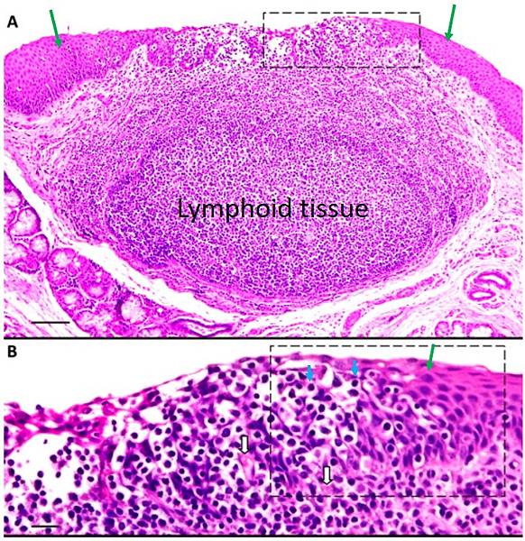 圖四:上圖是牛的鼻咽上皮細胞層(A,綠箭頭)及上皮細胞(B,綠箭頭)。藍箭頭是上皮細胞旁的淋巴細胞,其中B1b cell-IgM會去抓病毒,然後回到淋巴組織(Lymphoid tissue)去分裂,產生更多種IgM與病毒結合。抓到病毒的B1b-IgM在淋巴組織會遇上Marginal zone(MZ) B cell,於是MZ B cell-IgM也會一起抓到病毒而活化分裂,產生更多、更多種IgM與病毒結合。因此,與生俱來的Innate immunity有三層抗體防護:Natural antibody--->B1b cell--->MZ B cell。病毒越過這三層防護才會進入細胞,接下來NK cell會殺死被病毒感染的細胞,並把病毒一起殺掉,但這種清除病毒的用處僅限於少量病毒感染,一旦病毒感染擴大,就必須啟動T cell immunity--->Dendrtic cell(DC)吞食病毒蛋白後將蛋白分解成Peptide,並用MHC-II呈現給Th cell。Th cell發現DC呈現出來的Peptide是Non-self antigen便會活化(這叫Antigen presentation)。