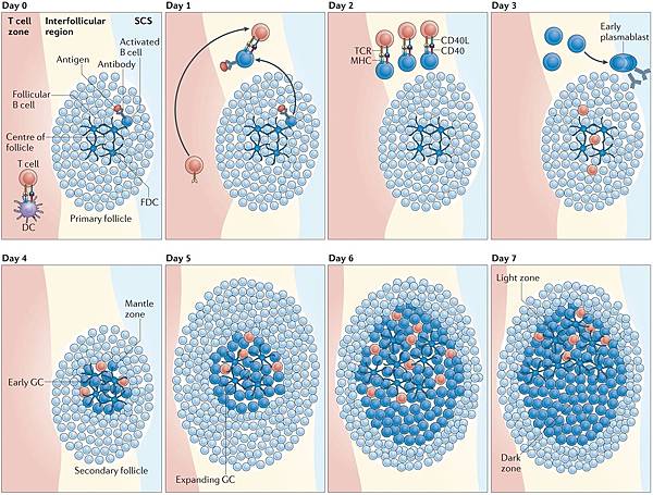 圖五:Day 0:T cell-DC(Dendritic cell)經Antigen presentation活化後,分化出Follicular helper T cell(Tfh)。Day 1:Tfh與follicular B (fB) cell進行Antigen presentation,fB cell活化。Day 2: Tfh與fB cell分裂。Day 3: fB cell活化後產生抗體,Tfh進入Primary follicule。Day 4: fB cell在 primary follicule分裂形成Secondary follicle。Day 5-7:Germinal center形成,fB cell在Germinal center進行抗體基因的隨機突變,把抗體與抗原結合的部位突變(Somatic hypermutation),產生新的B cell clone,製造人類定義的專一性抗體。這是T cell-dependent antibody production,急性病毒或細菌感染後,可在血中測到這種抗體。