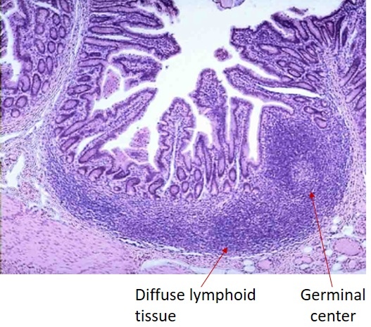 圖六:空腸(Ileum)的黏膜下淋巴組織,沒活化狀態是Diffuse lymphoid tissue,活化狀態會出現Germinal center。